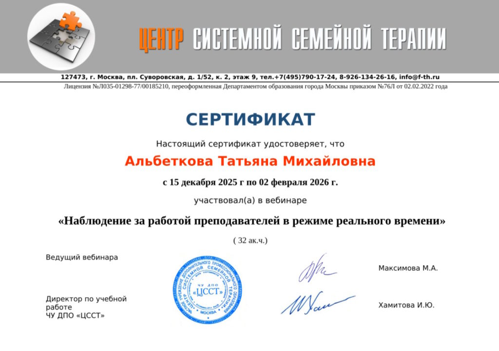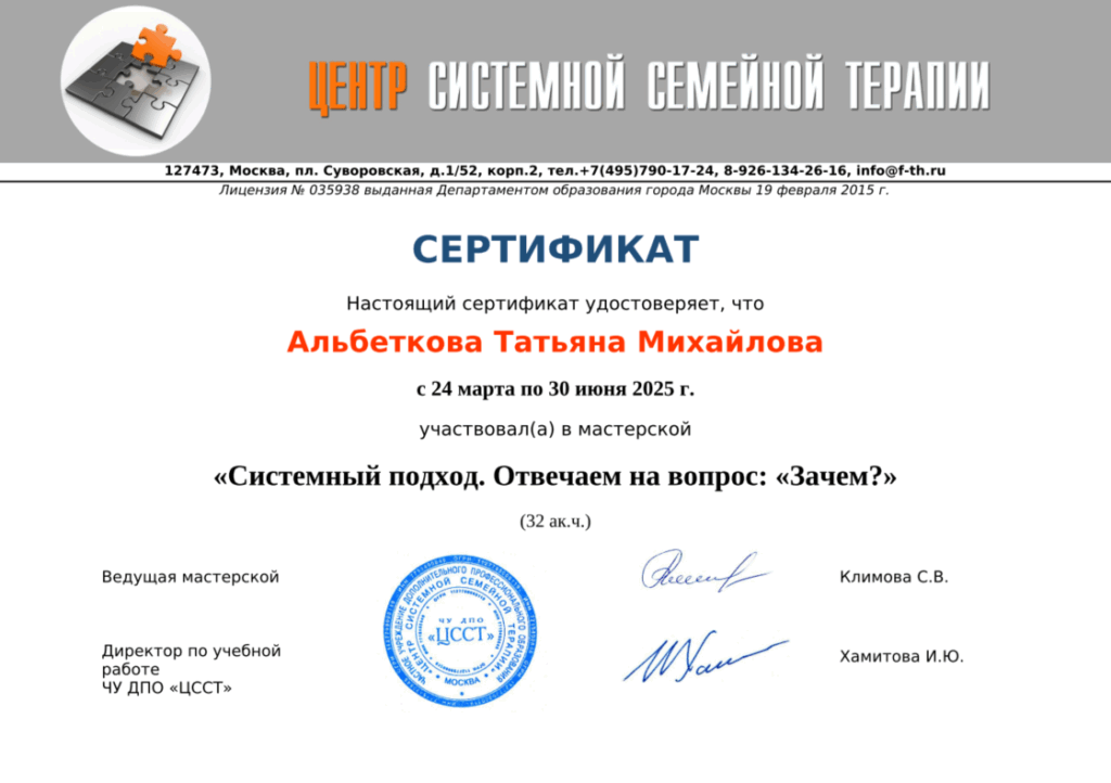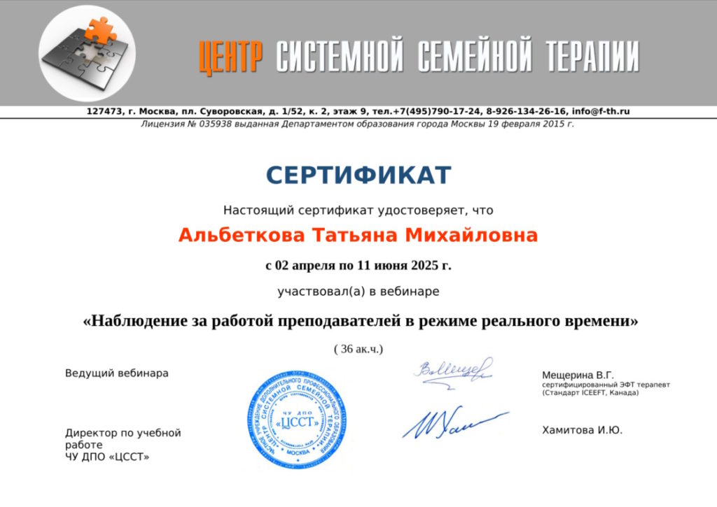 - На постоянной основе прохожу личную психотерапию, супервизию и повышение квалификации.